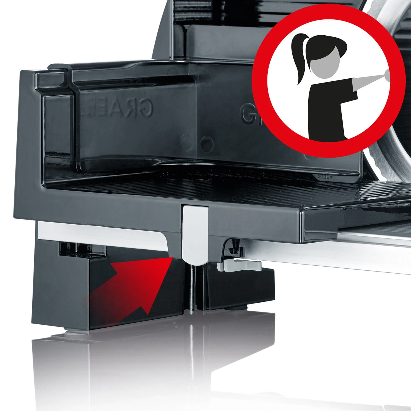 Krajalnica Graef Style S10 została zaprojektowana z myślą o wygodzie i bezpieczeństwie użytkownika. Optymalna prowadnica wózka pozwala na płynne i bezproblemowe przesuwanie żywności podczas krojenia, a osłona noża minimalizuje tarcie i chroni przed przypadkowymi skaleczeniami. Dodatkowo, blokada bezpieczeństwa zapewnia ochronę przed niekontrolowanym uruchomieniem, co jest szczególnie ważne, jeśli w domu są dzieci.